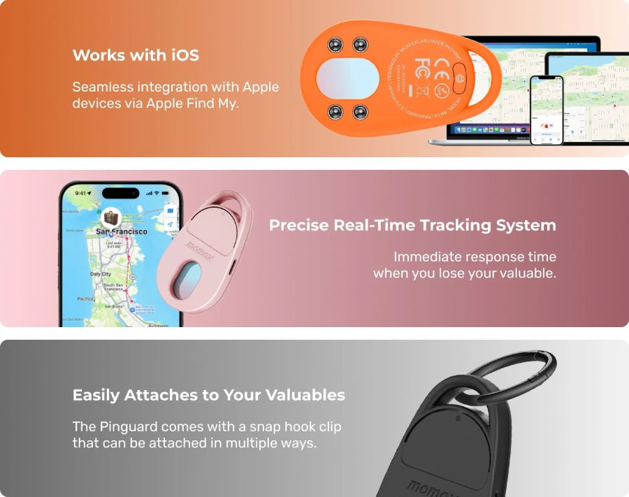 為用家提供追蹤數據的科技世界!無論您是 Apple 的粉絲還是 Momax 團隊的一員,Pinguard 查找「我的定位器」都可以輕鬆連接,幫助您輕鬆找到貴重物品。您可以在 Apple App Store 中下載 Apple Find My 應用程式。
