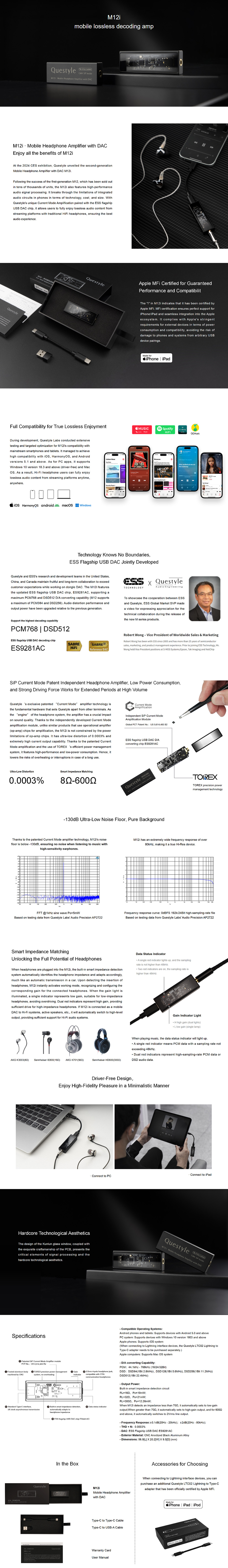 M12i USB DAC 耳機放大器搭載優化的 HiFi 音訊架構,確保高解析音質。此便攜式 USB DAC 可相容多種系統,包括 Android、iOS、Windows、Mac,並支援最新裝置:手機、電腦、平板、筆電、音樂播放器等。無論通勤、居家、辦公或遊戲,都能展現極佳的多功能性。