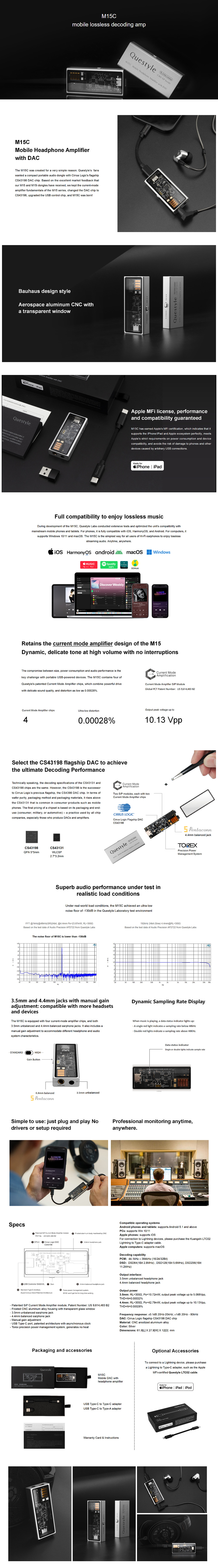 M15C 可相容大多數電腦、智慧型手機與筆記型電腦,支援解碼 PCM 從 16Bit/44.1kHz 至 32Bit/384kHz,甚至支援 1Bit 的 DSD256,帶來完整無損音樂體驗。