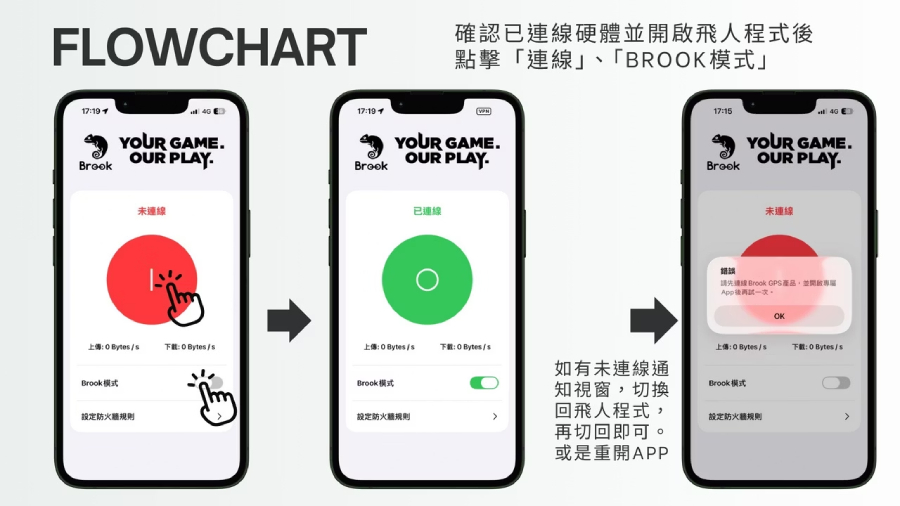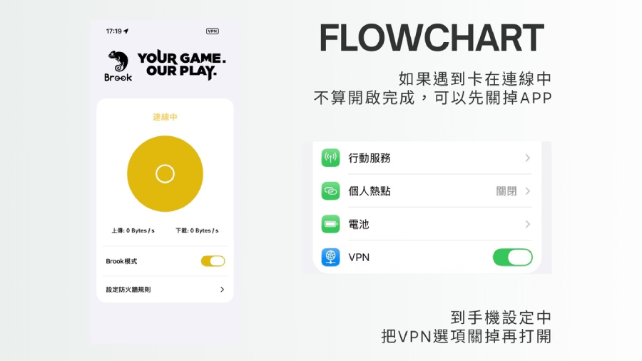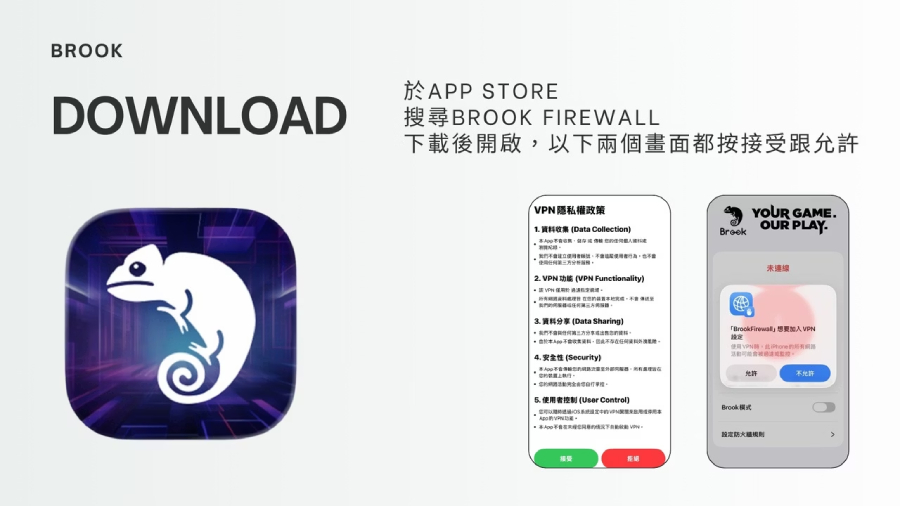 - ※當Brook Firewall下載開啟安裝後,會於手機設定中多一個VPN選項開關。VPN關了之後,Brook Firewall模式會跟著關閉且失效。