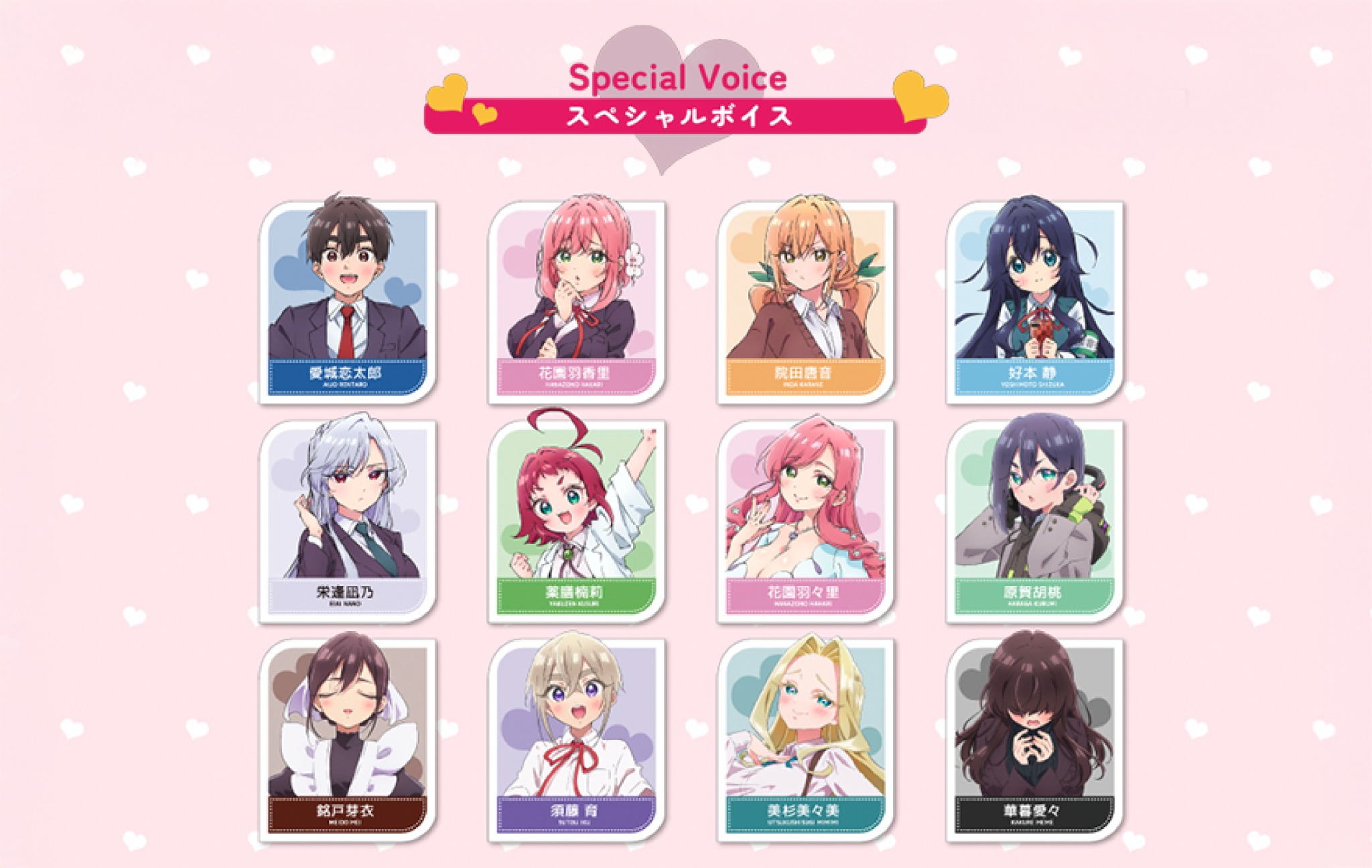 收錄《超超超超超喜歡你的100個女朋友》主角愛城戀太郎(CV: 加藤涉) 及其11位女友,花園羽香里(CV:本渡楓)、院田唐音(CV:富田美憂)、好本靜(CV:長繩麻理亞)、榮逢凪乃(CV:瀨戶麻沙美)、藥膳楠莉(CV:朝井彩加)、花園羽羽里(CV:上坂堇)、原賀胡桃(CV:進藤天音)、銘戶芽衣(CV:三森鈴子)、須藤育(CV:高橋李依)、美杉美美美(CV:Lynn)、華暮愛愛(CV:高尾奏音)。原班聲優陣容全新錄製超過 250 種語音。