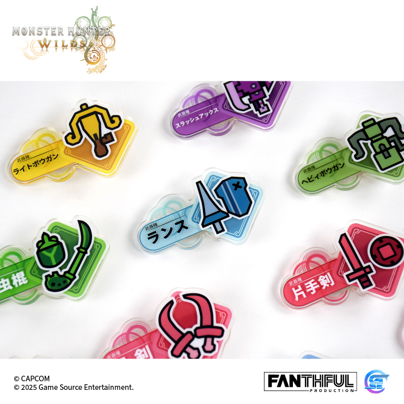以遊戲中玩家們熟識的獵人武器圖標為主題設計的亞克力夾子。全14種風格各異的武器種類,悉數登場! 款式:大劍、太刀、單手劍、雙劍、大錘、狩獵笛、長槍、銃槍、斬擊斧、充能斧、操蟲棍、輕弩槍、重弩槍、弓,共14款盲盒包裝