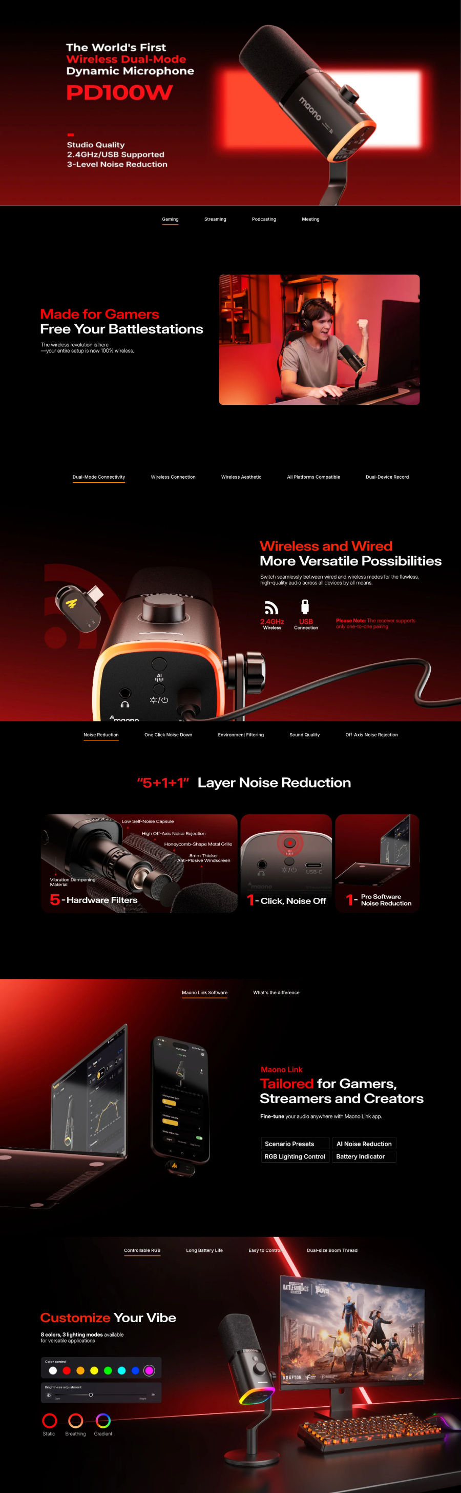- 透過 Maono Link 軟體,一鍵微調 EQ、降噪、RGB 效果與音效預設。