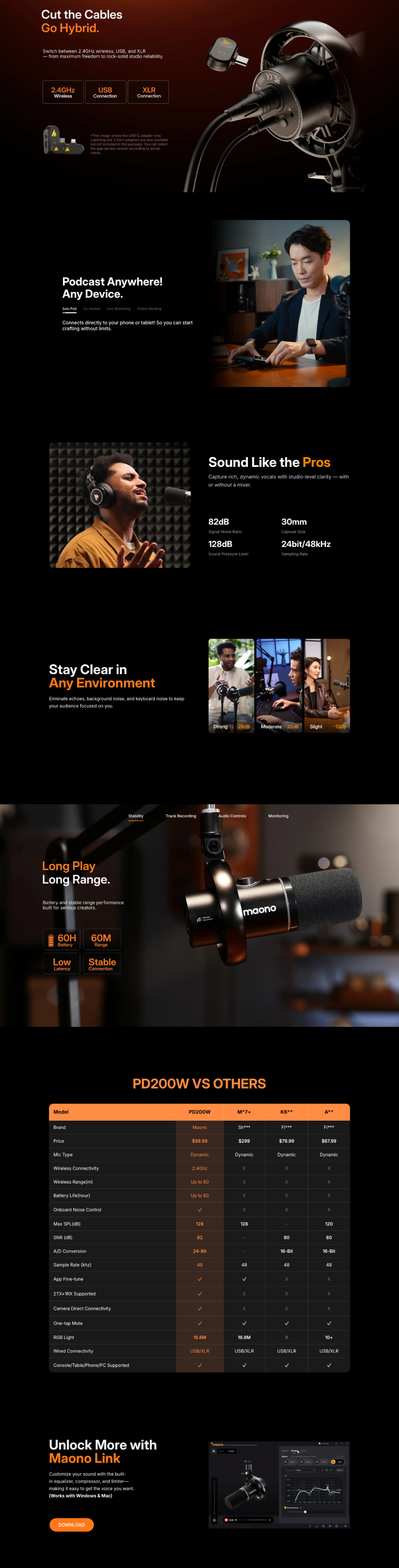 • 智慧錄音室音效: 30mm 動圈麥克風與心型指向收音,提供飽滿專業音質。可透過 Maonolink 應用程式輕鬆微調音色與混響。