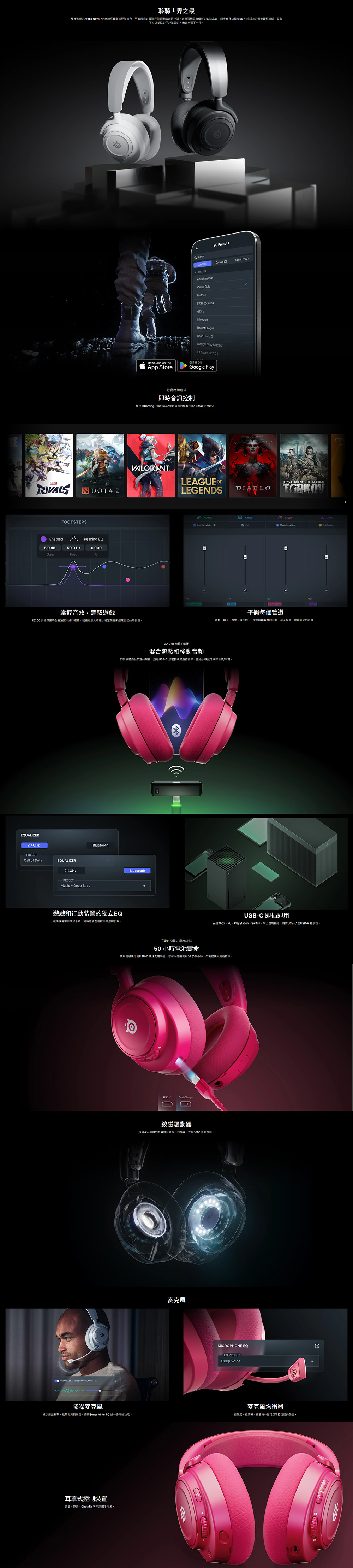 • 透過2.4GHz與藍牙技術,同時 混音遊戲音效與行動裝置音訊50+小時電池續航 力,支援優化快速充電技術