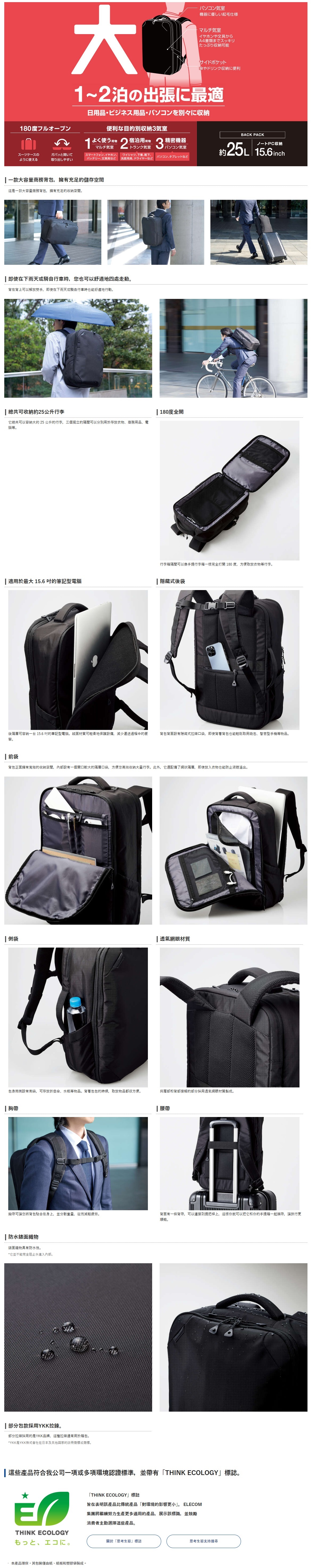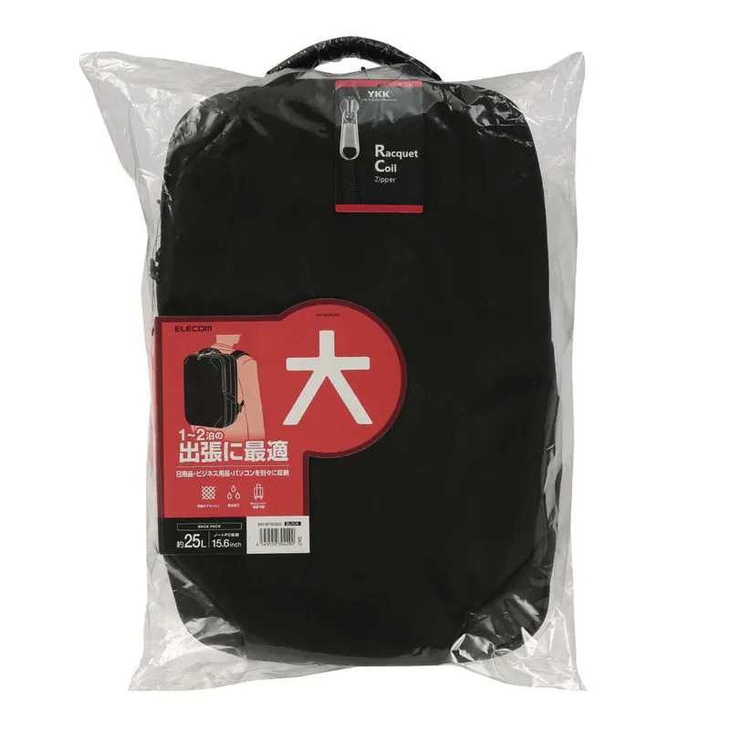 ELECOM 大容量商務背包 (黑色),專為日常通勤與商務旅行設計。擁有約 25 公升收納空間,三大主隔層可分別放置衣物、商務用品與筆電。背包可 180 度全開,如同行李箱般方便整理,並配備防潑水材質與多功能口袋,讓您在各種場合都能輕鬆應對。