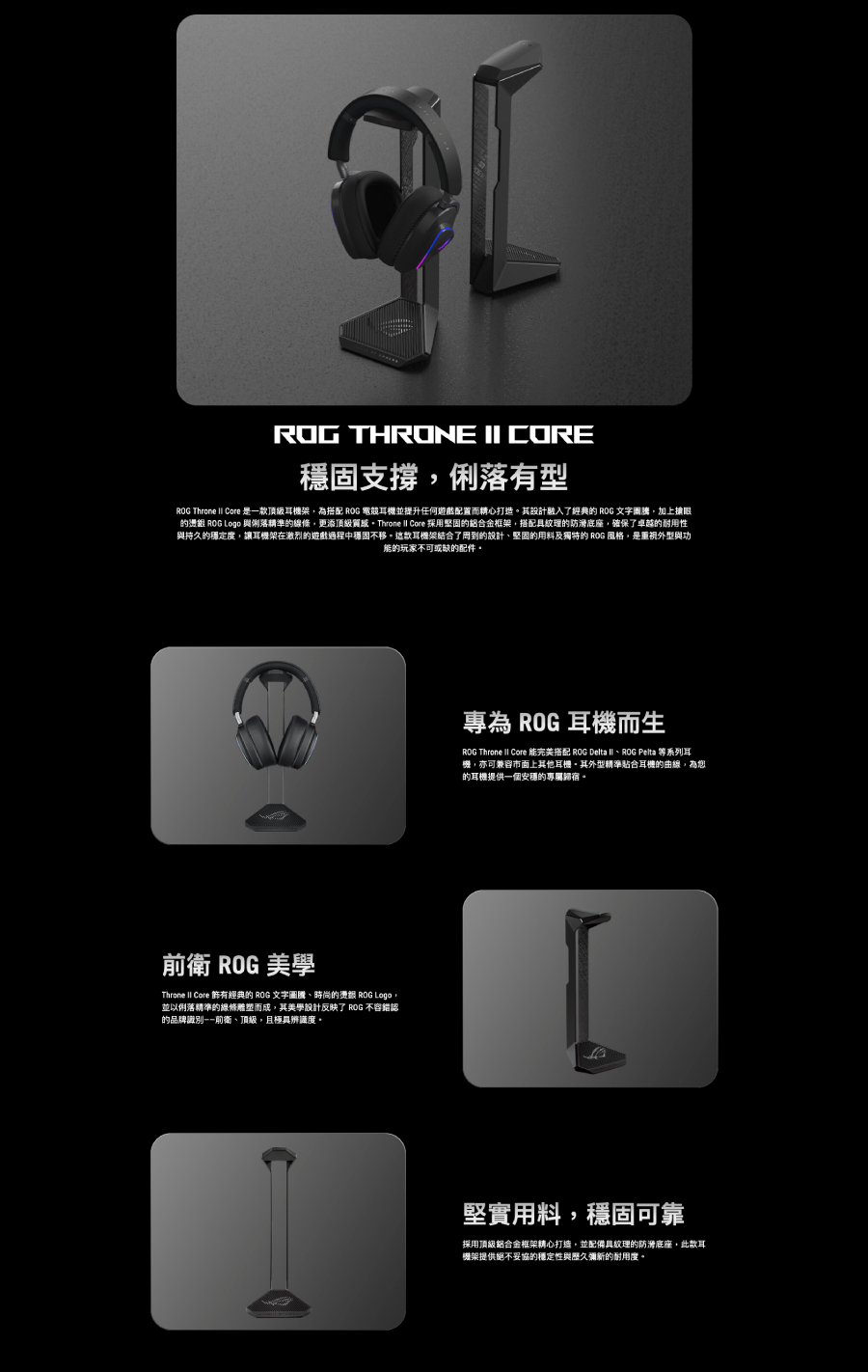 ROG Throne II Core 電競耳機架,專為 ROG 電競耳機而生。採用 ROG 經典文字圖騰、燙銀 ROG Logo,搭配堅實的鋁合金框架與防滑底座,兼具頂級美學與絕佳穩定性。