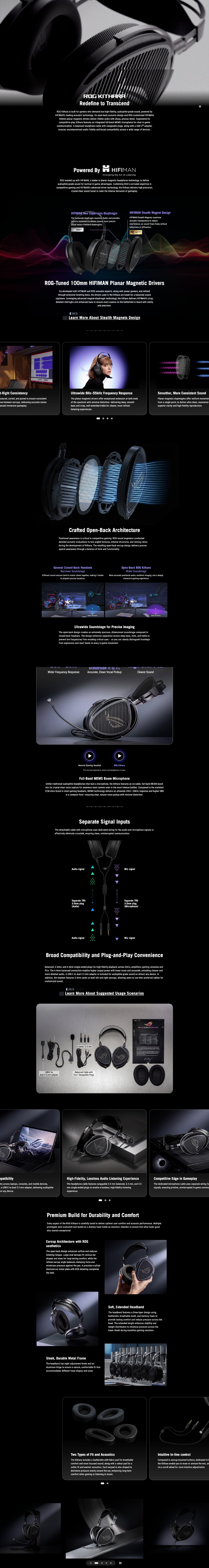 ASUS ROG Kithara 遊戲耳機,搭載 ROG 調校的 100mm HIFIMAN 平面磁性驅動單體、開放式設計、全頻 MEMS 麥克風、雙 3.5mm 輸入、4.4mm 平衡、3.5mm、6.3mm 單端插頭