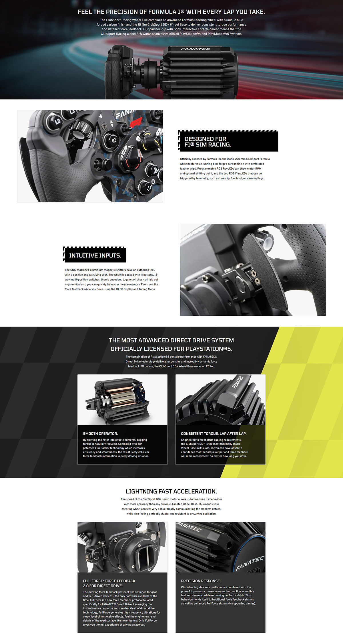 結合先進的 Formula 方向盤與獨特藍色鍛造碳纖維外觀,搭配 15 Nm ClubSport DD+, 提供穩定持續的扭力輸出。FullForce 技術將高保真震動提示與核心力回饋信號融合, 帶來更沉浸的駕駛體驗。