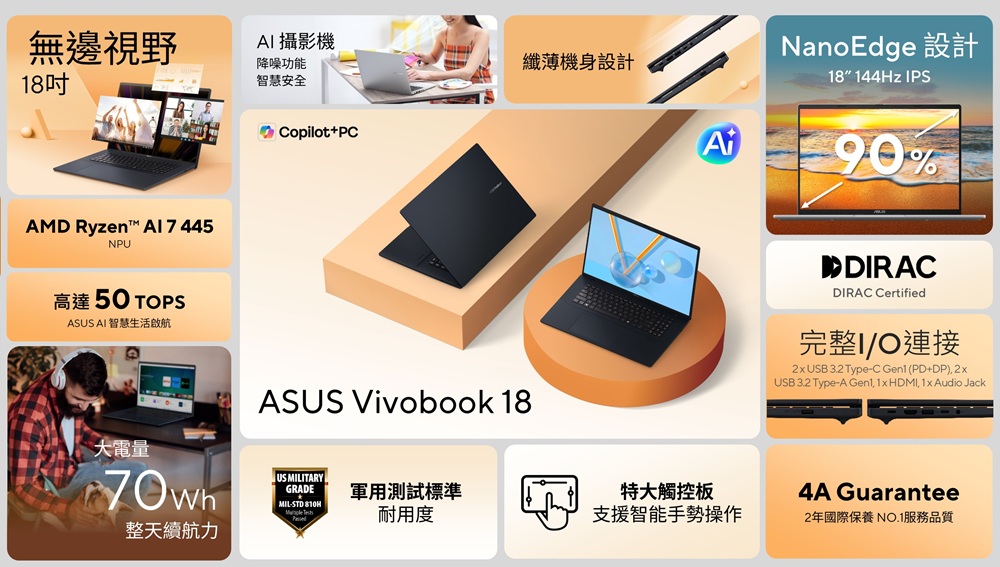 18吋特大螢幕,採用NanoEdge窄邊框設計,支援90%極高螢幕佔比,提供無邊視野。纖薄機身採用沈穩配色,提供軍規測試標準的耐用度。70Wh大電池,高達50 TOPS AI算力的Ryzen AI系列NPU,支援整日續航力及新世代AI運算速度。