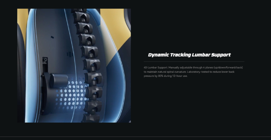 自動追蹤支撐隨您移動—上下/前後—在腰痛發生前即時緩解。適合身高 5'4"–6'5" 的玩家,單旋鈕張力控制可記憶您的最佳設定。告別駝背,長達 12 小時的遊戲也能保持專業姿勢。