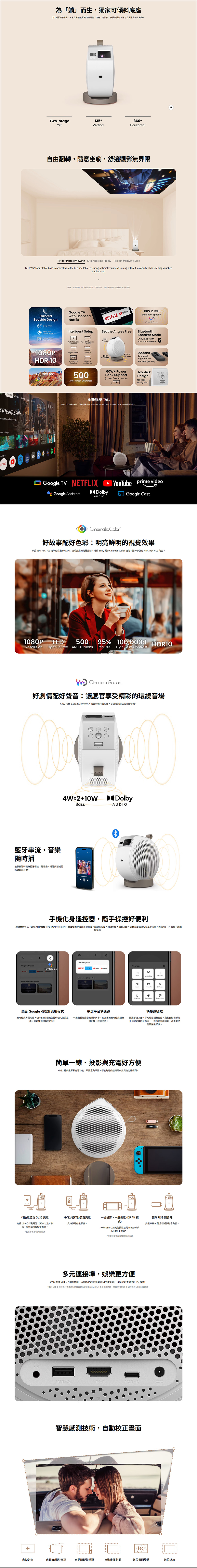 - 360° 水平旋轉底座 & 兩段式傾角,一轉投影天花板;四大智慧感測,自動調整超方便