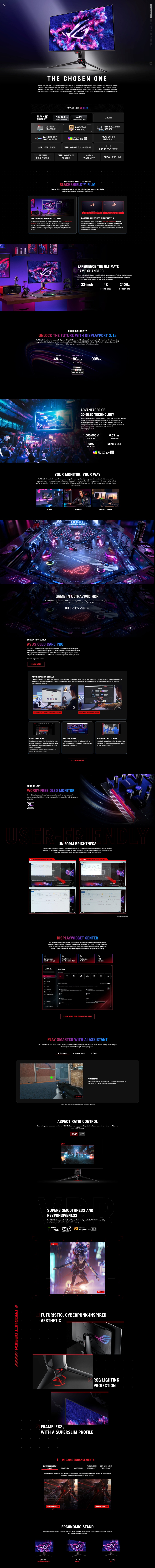 ROG Swift OLED PG32UCDM Gen3 (PG32UCDM3) gaming monitor ― 32-inch (31.5 inch viewable) 4K (3840 x 2160) QD-OLED panel, 240 Hz, BlackShield™ film, G-SYNC® compatible, Neo Proximity Sensor, VESA DisplayHDR™ 500 True Black, OLED Care Pro, 90 W Type-C®, and ASUS DisplayWidget Center, DisplayPort™ 2.1a UHBR20 (80Gbps full bandwidth)