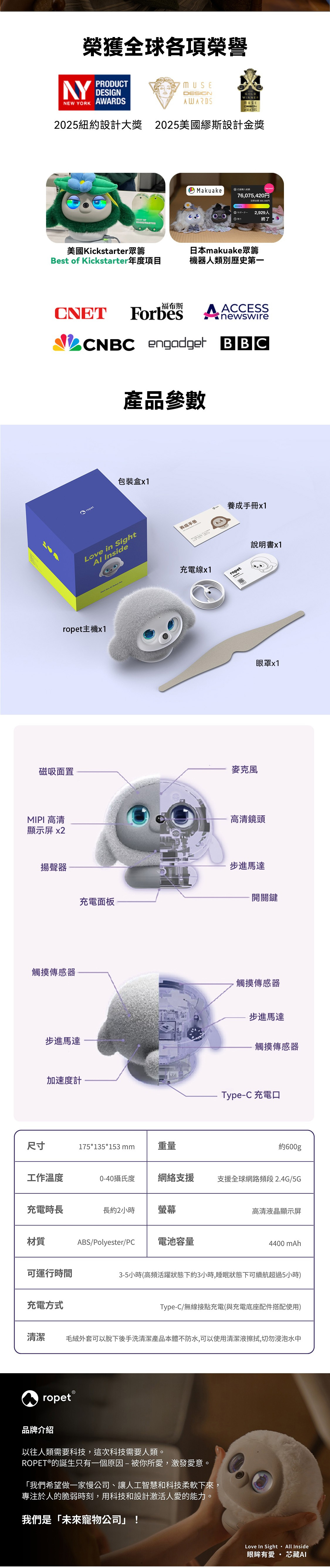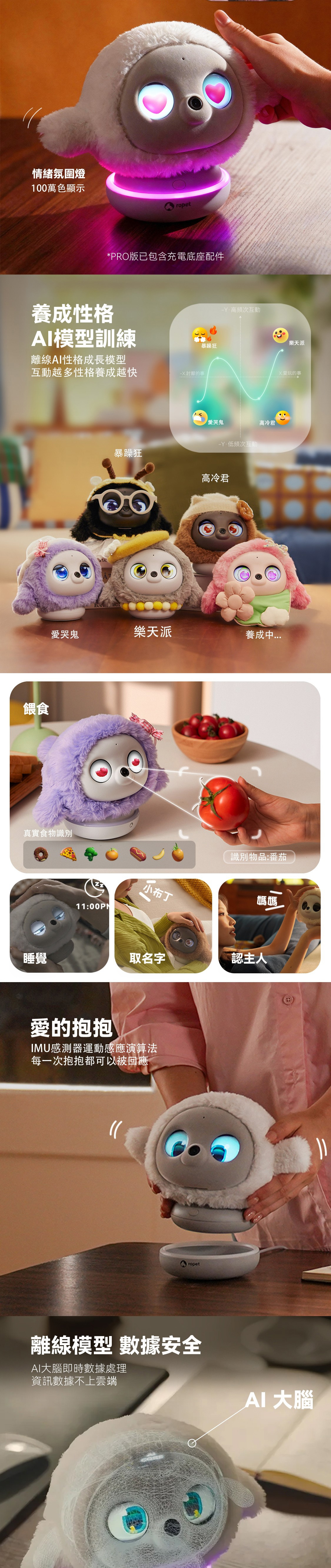 - Ropet 具備先進的AI情緒識別技術,能夠通過鏡頭與麥克風感知用戶狀態,智能分析當下情緒並給予適當回應。