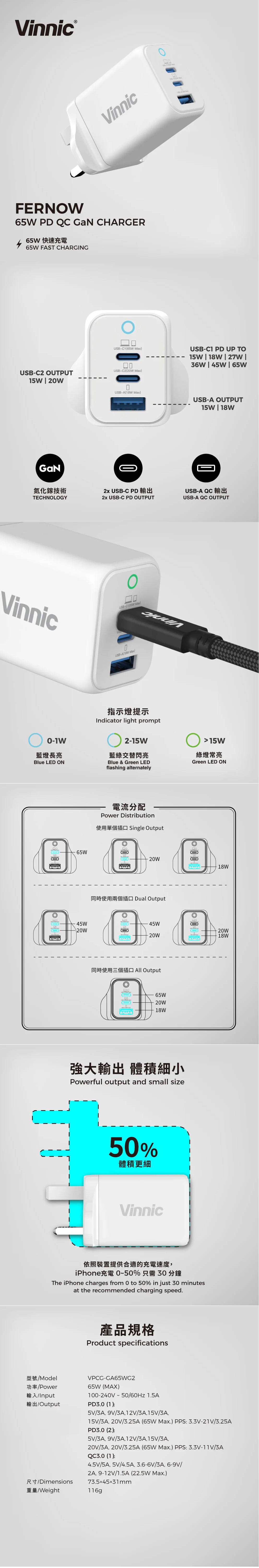 Vinnic FERNOW 65W PD QC GaN 充電器(白色)