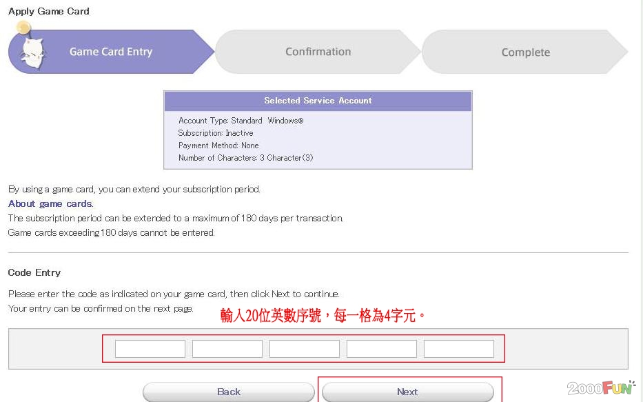 3.  輸入20位英數序號,每一格為4字元。輸入完成後,按「Next」。
