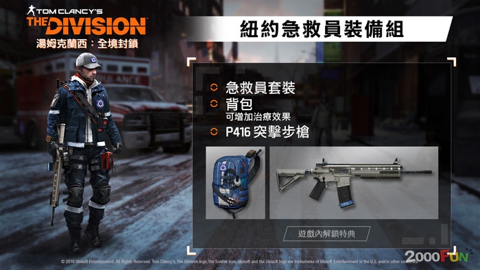- 《湯姆克蘭西:全境封鎖》追加內容DLC - 紐約急救員裝備組 激活序號一組