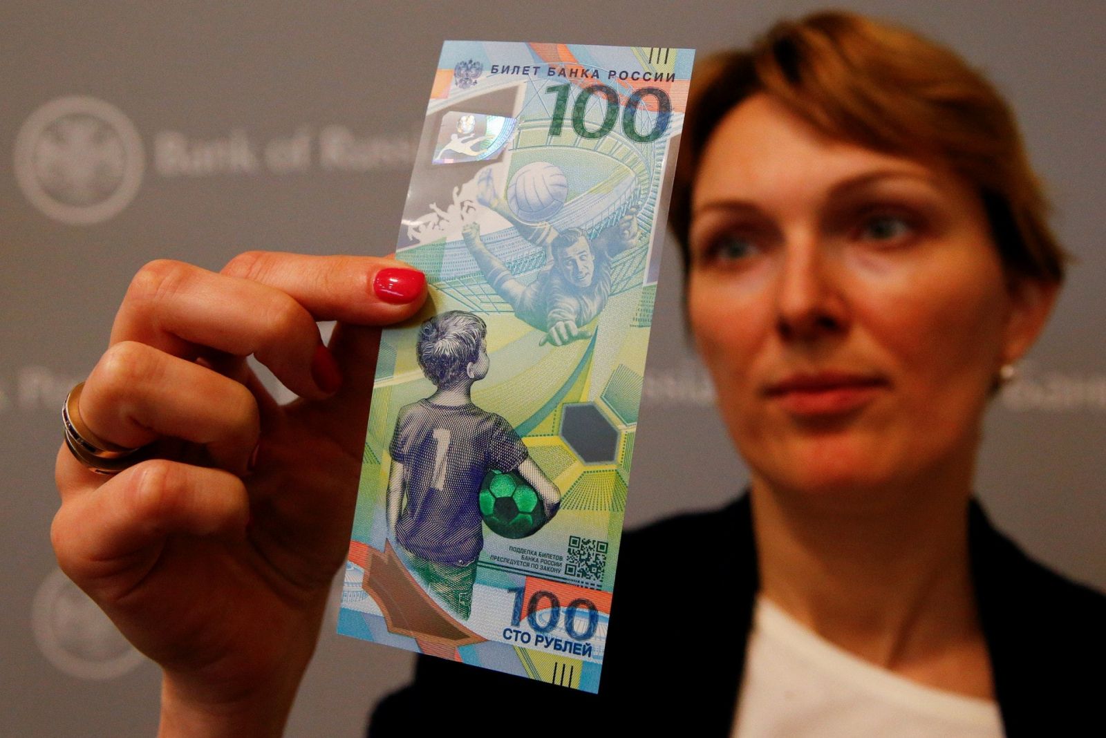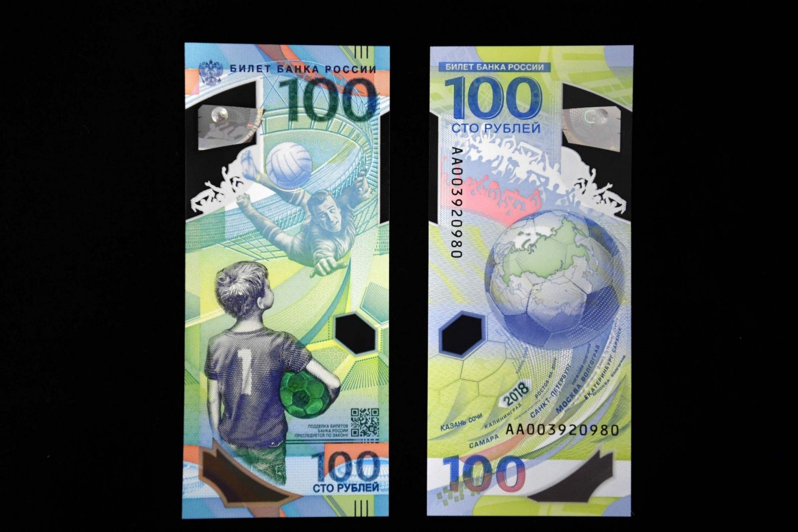 紀念鈔一面印有蘇聯傳奇門將耶辛飛撲的圖案,另一面則有俄羅斯地圖及主辦城市的名字。