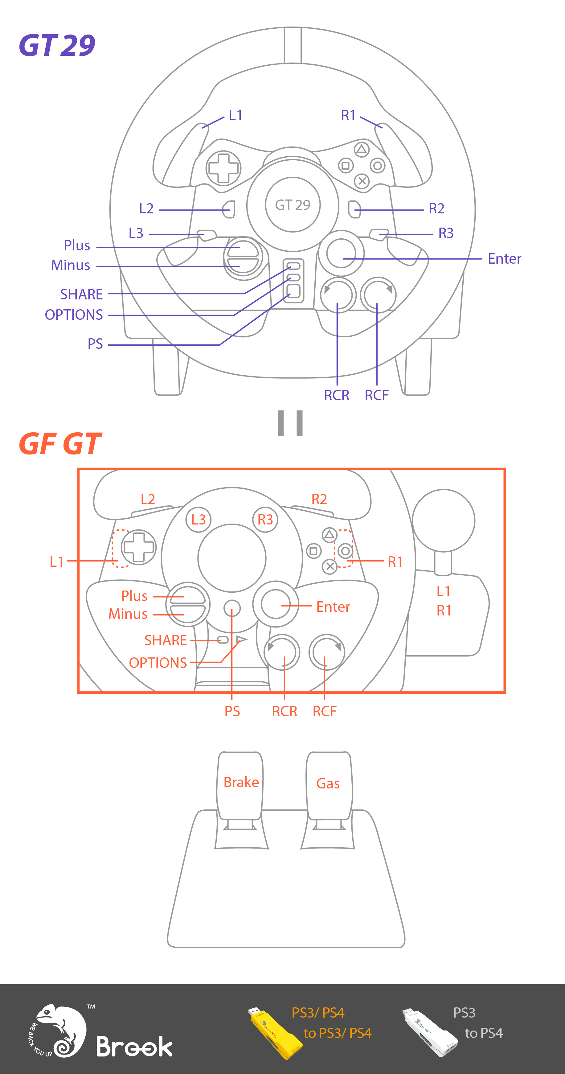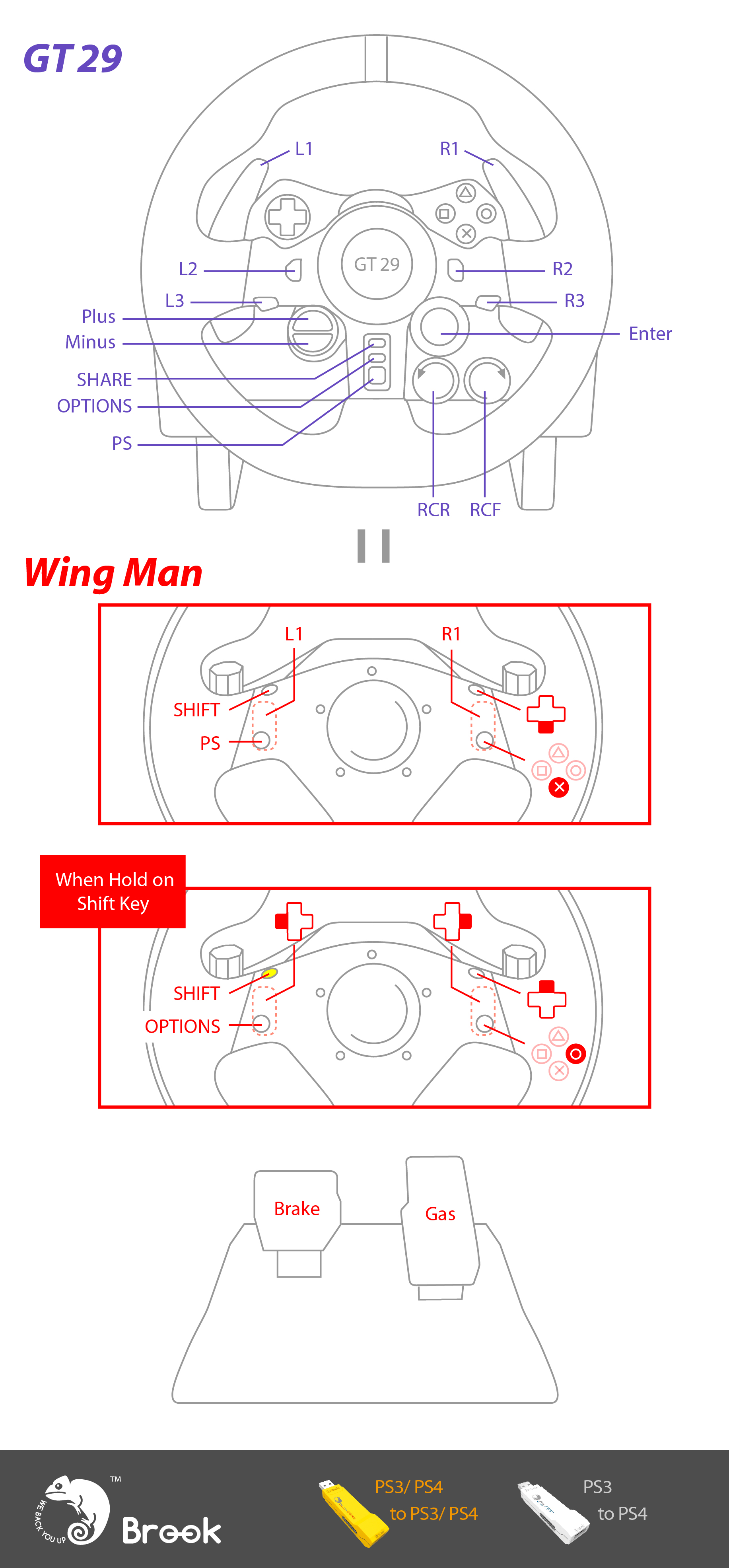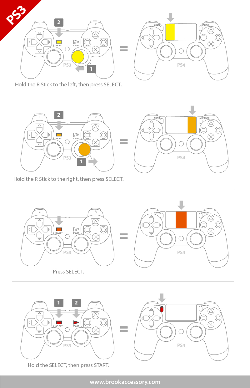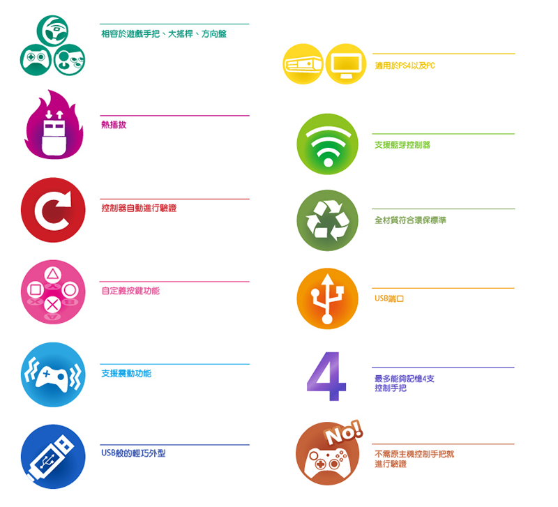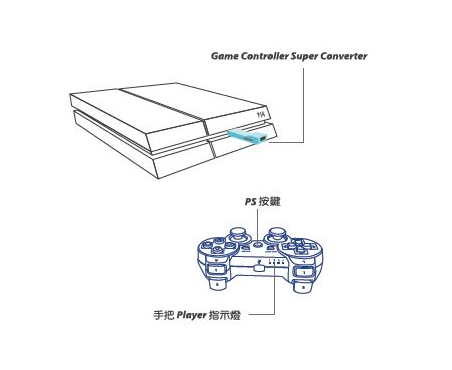 將現有的 PS3 手把直接使用於 PS4 主機或者 PC 主機上進行遊戲操控,另增加Turbo連發功能以及Custom Buttons設定按鍵功能,並支援手把震動功能。