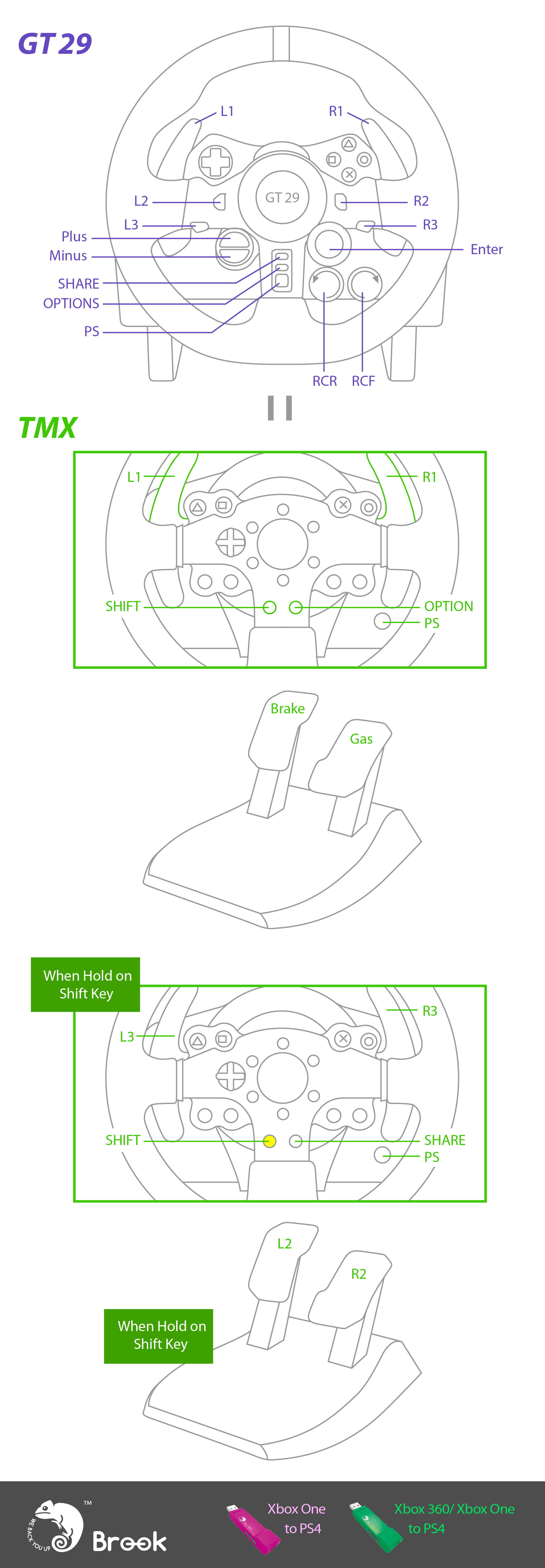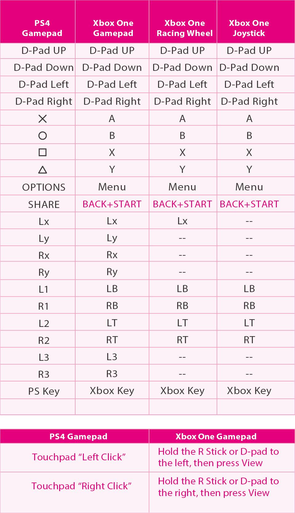 本產品可自動判斷 XBOX ONE 手把與方向盤功能,不需要(撥動開關)設定,自動對應PS4按鍵功能。