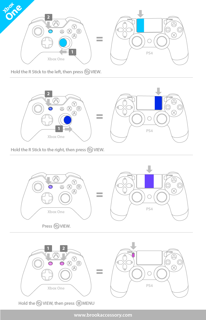 Super Converter提供模擬PS4控制器觸碰板按鈕功能:使用Xbox One視圖按鈕及右搖桿可模擬PS4觸碰板按鈕;使用Xbox One視圖按鈕及選項按鈕可模擬PS4 SHARE按鈕。