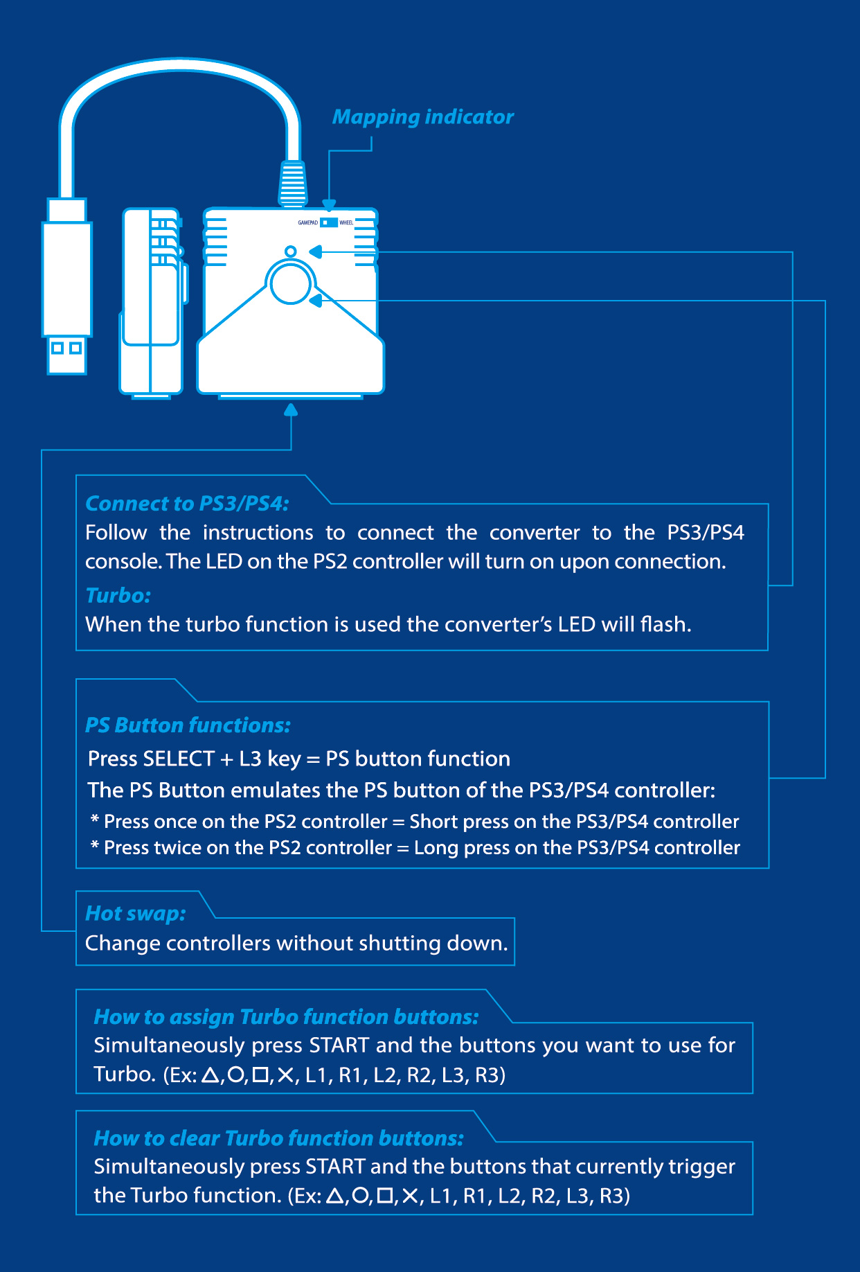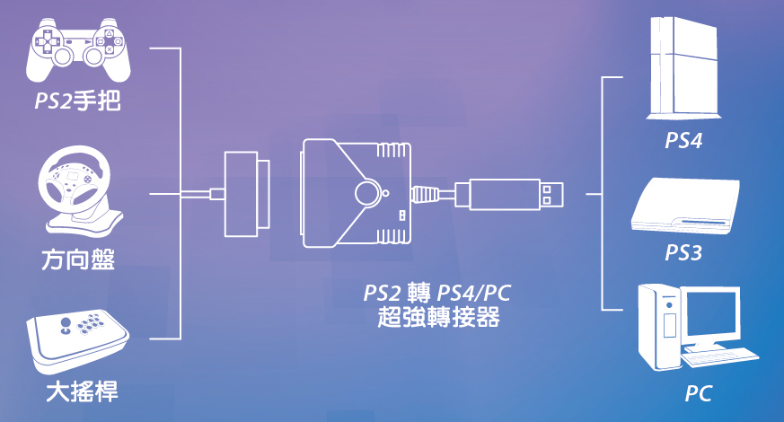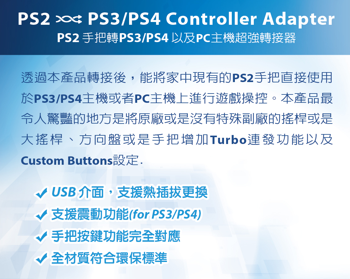 將 PS2 手把直接使用於 PS3/PS4 主機或者 PC 主機上進行遊戲操控,增加Turbo連發功能及手把震動功能。