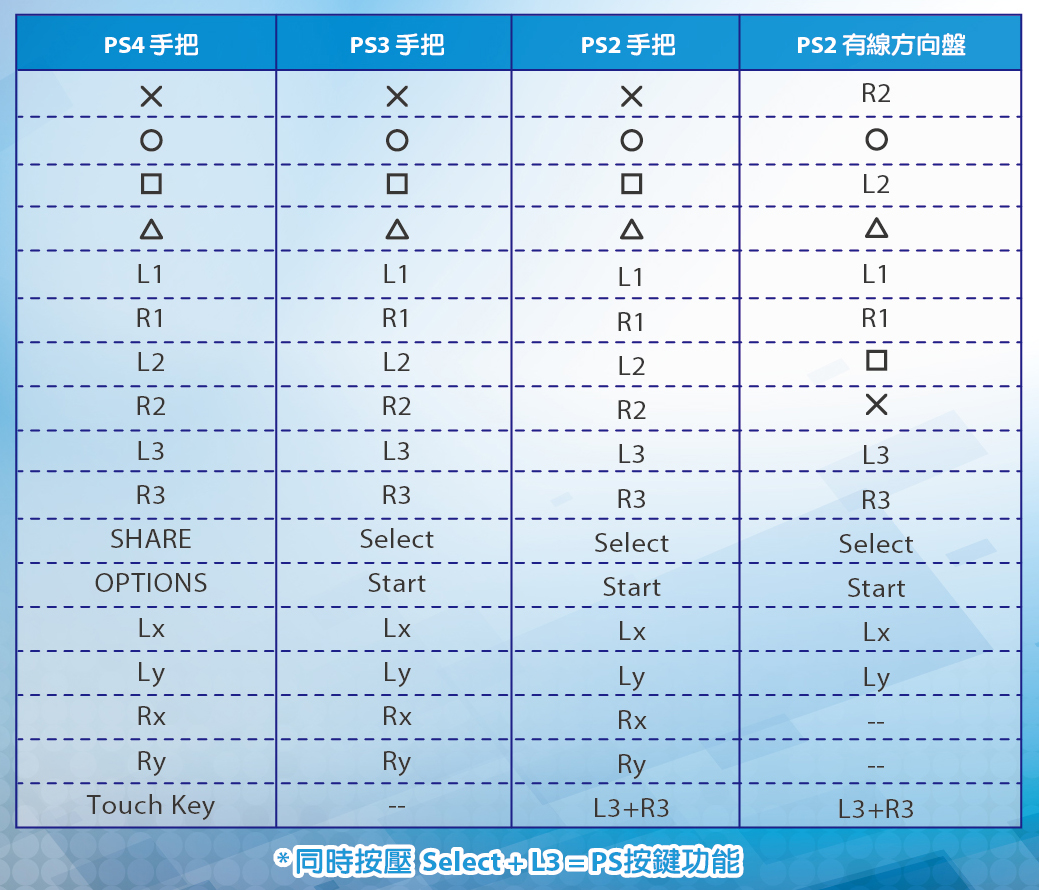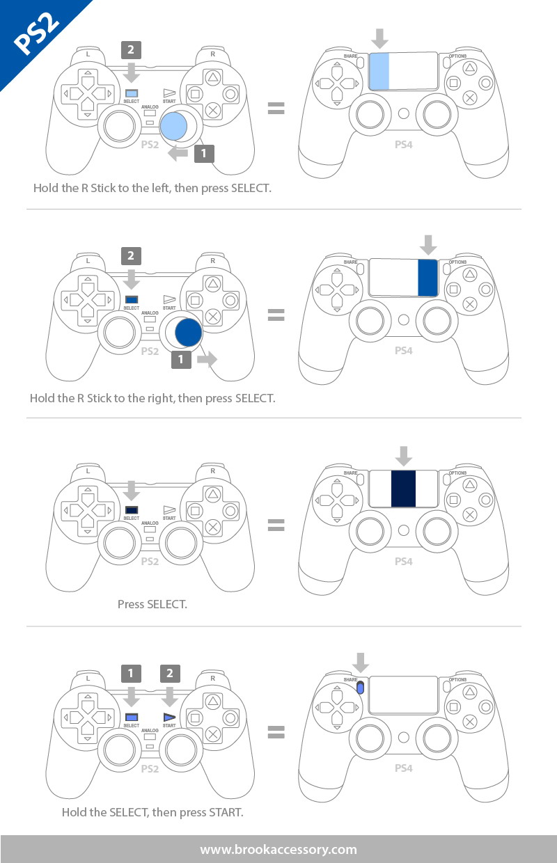 Super Converter提供PS4控制器觸碰板按鈕功能:使用PS2視圖按鈕右操作桿可模擬觸碰板按鈕;使用PS2視圖按鈕及START按鈕模擬SHARE按鈕。