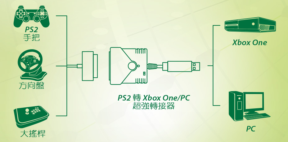 將 PS2  手把直接使用於 PS3/PS4  主機或者 PC 主機上進行遊戲操控,增加Turbo連發功能以及支援手把震動功能