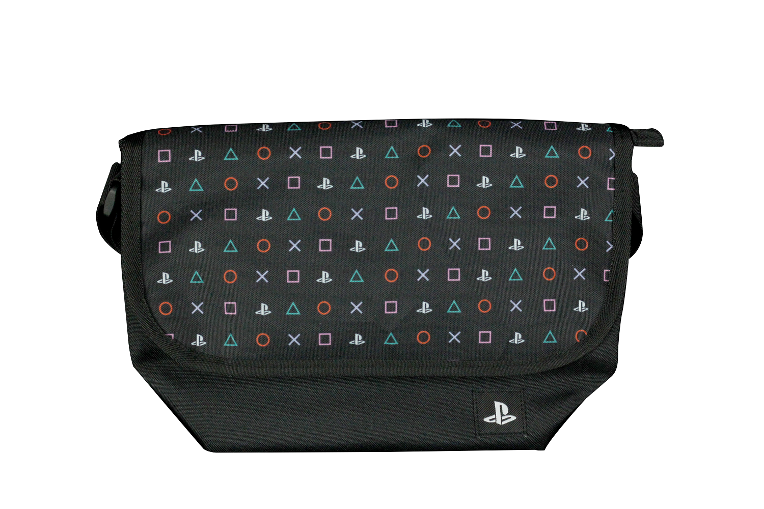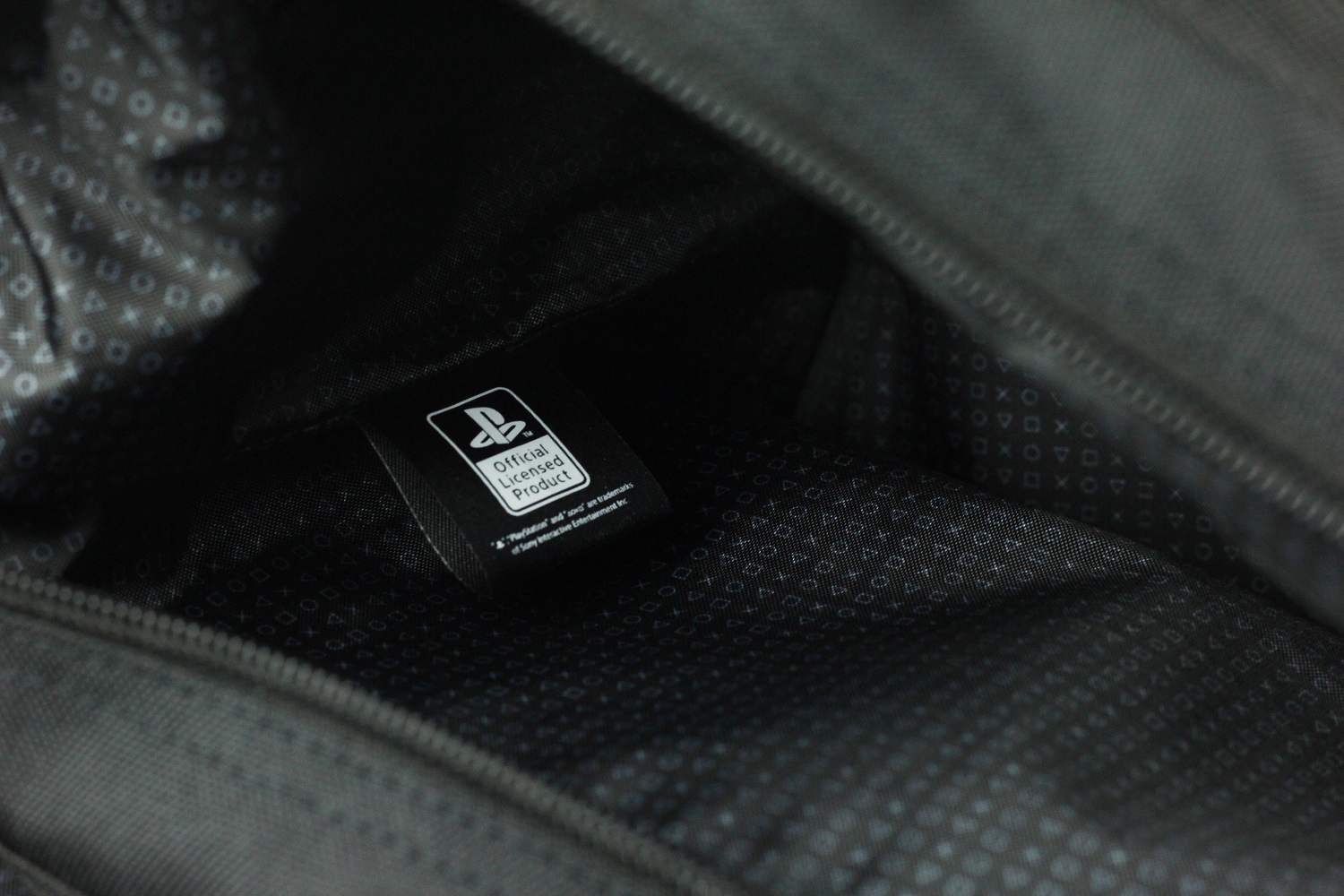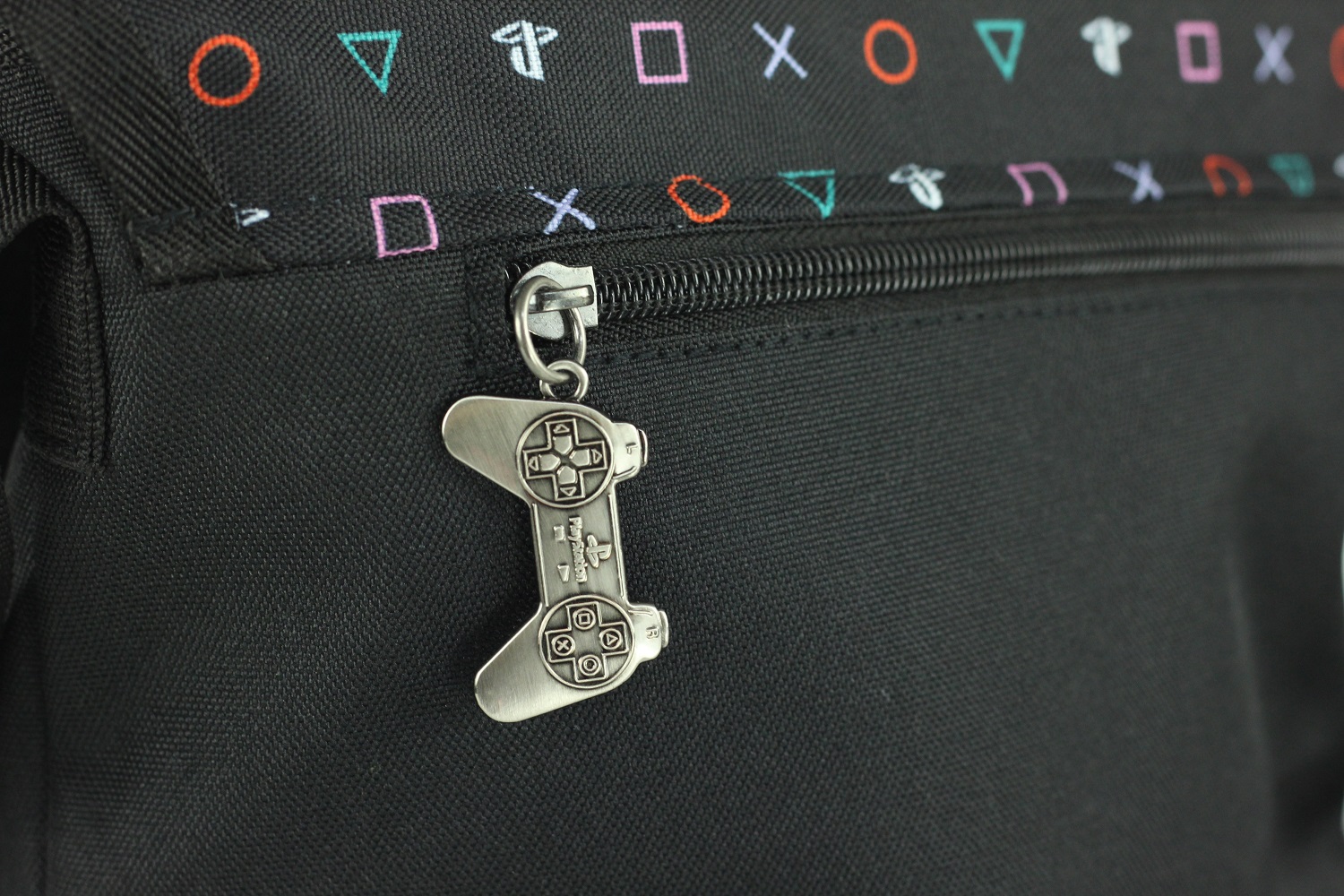 暗花4色△○×□背包及斜孭袋,銅製拉鏈扣為PlayStation®控制器外形,背包內有白色△○×□及Logo暗花。